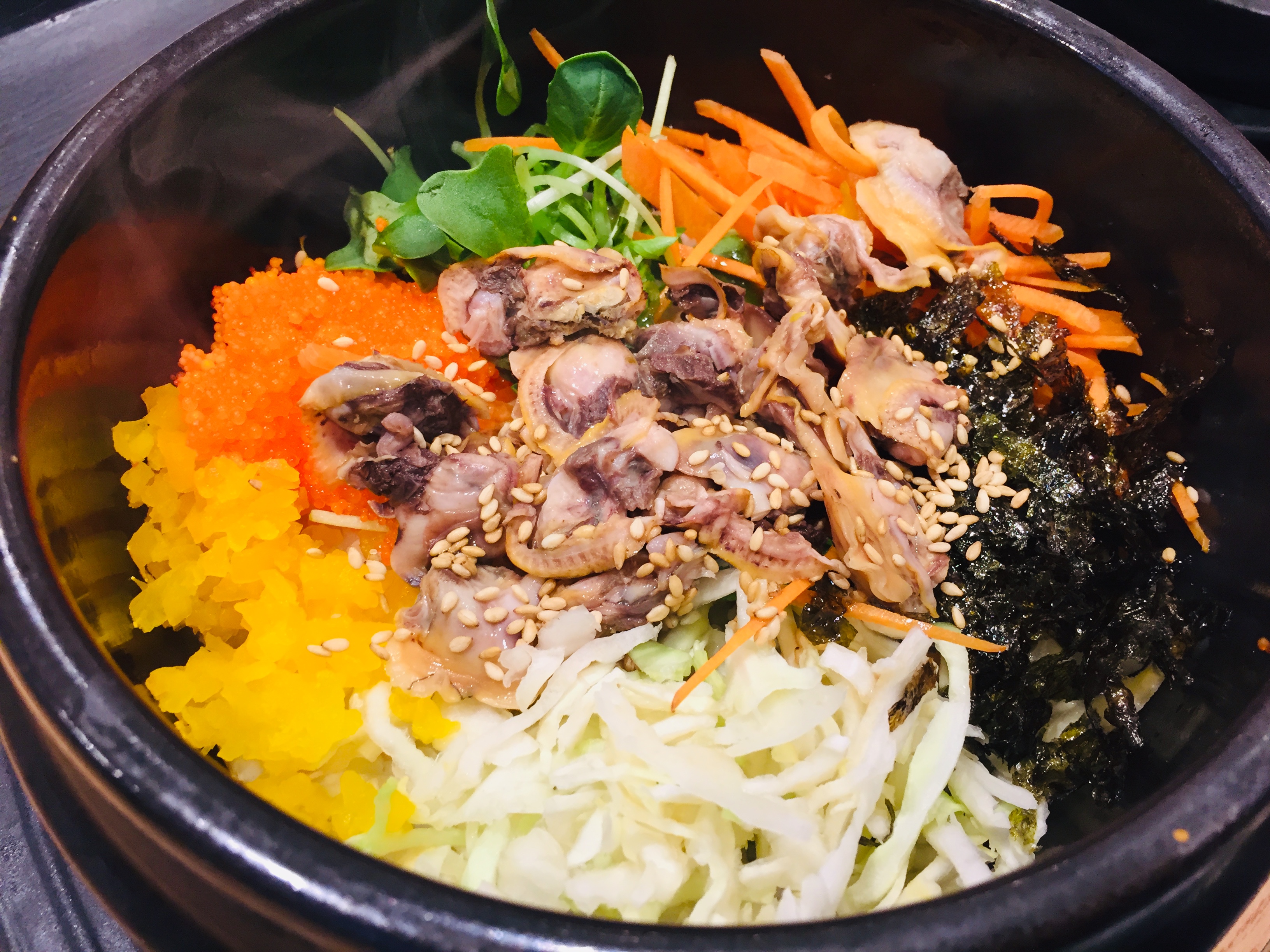 꼬막알밥은 양배추, 채썬 생당근, 단무지, 날치알, 새싹채소를 깔고 꼬막 그리고